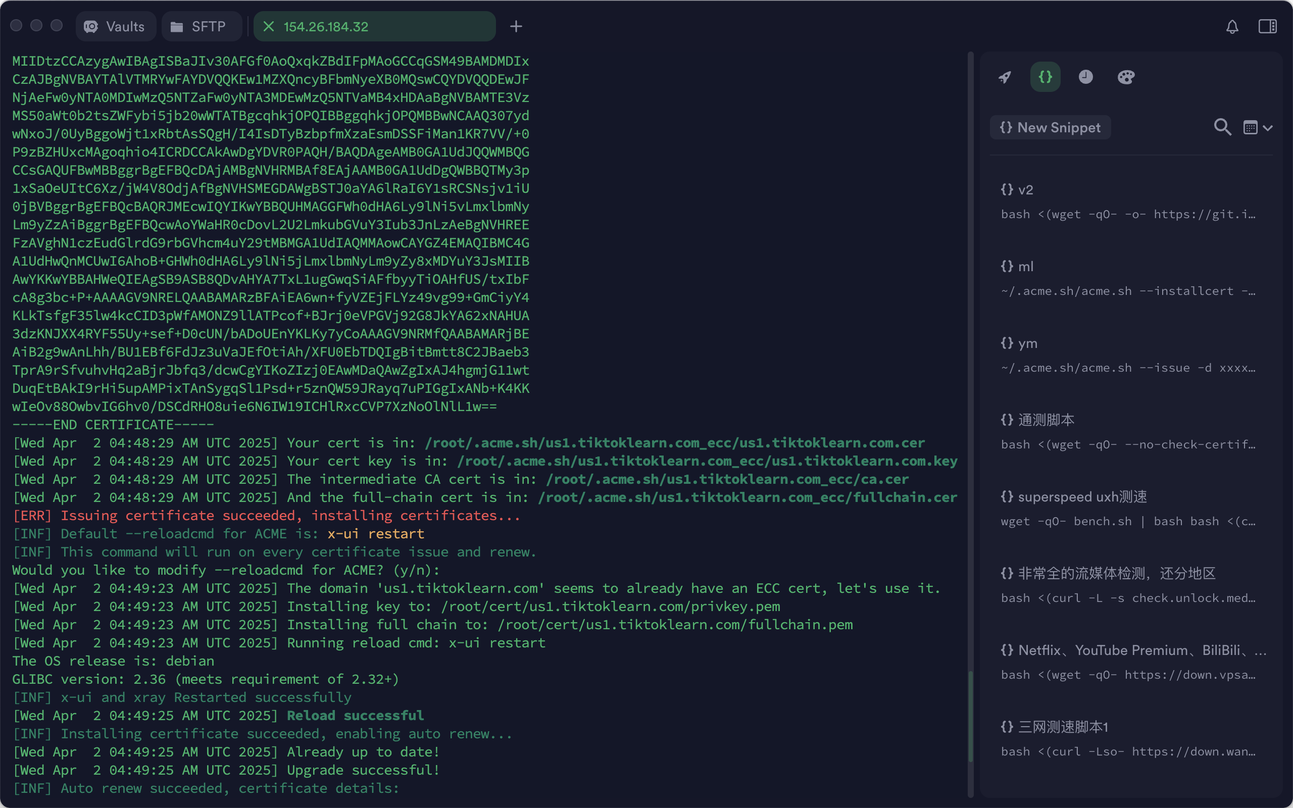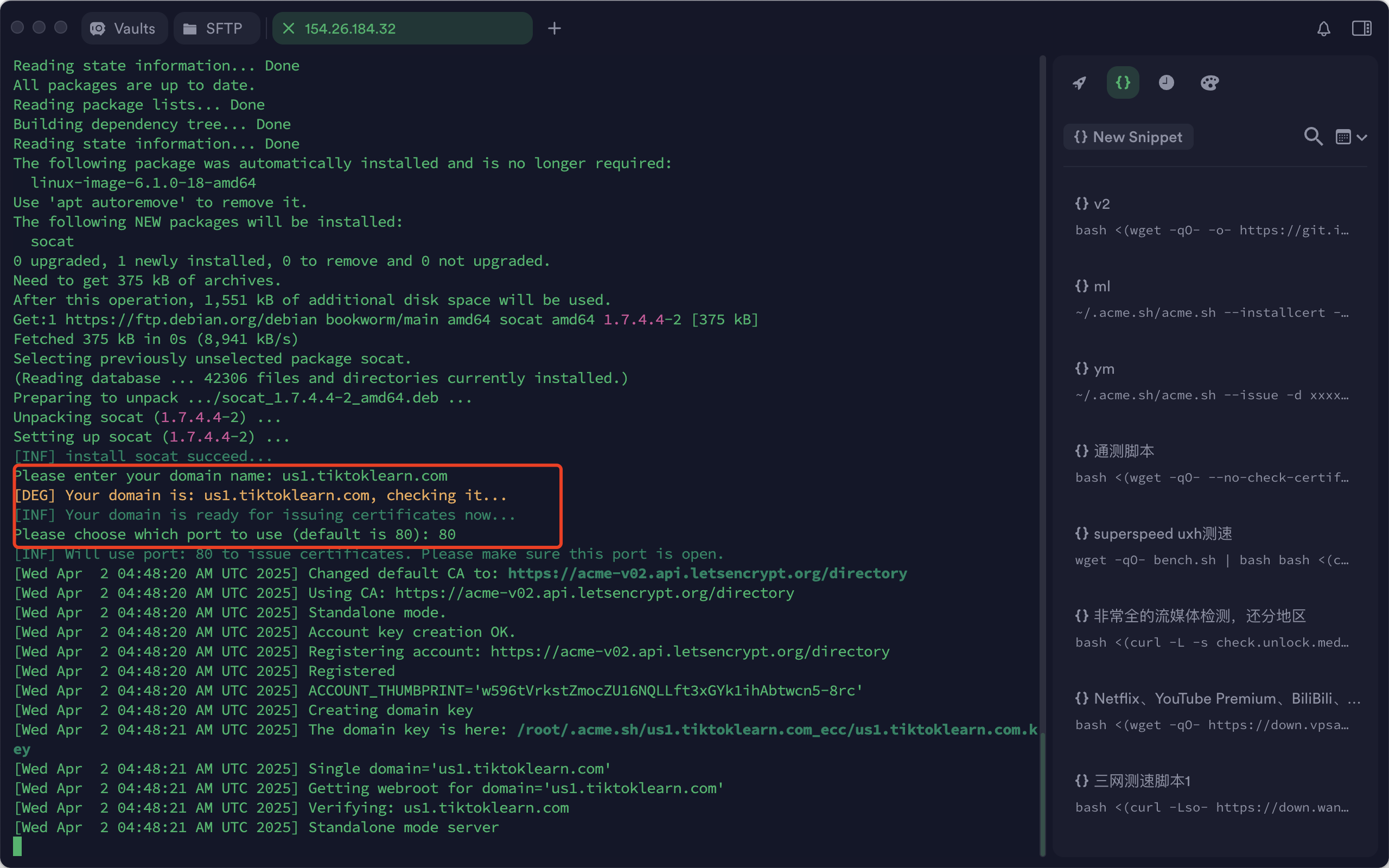 Username: tjw3sjTrwg Password: GlPJHMfbA0 Port: 54321 WebBasePath: o2NSOlh8DOQWznR Access URL: http://154.26.184.32:54321/o2NSOlh8DOQWznR3.3 申请SSL证书:给面板穿上“安全外衣”