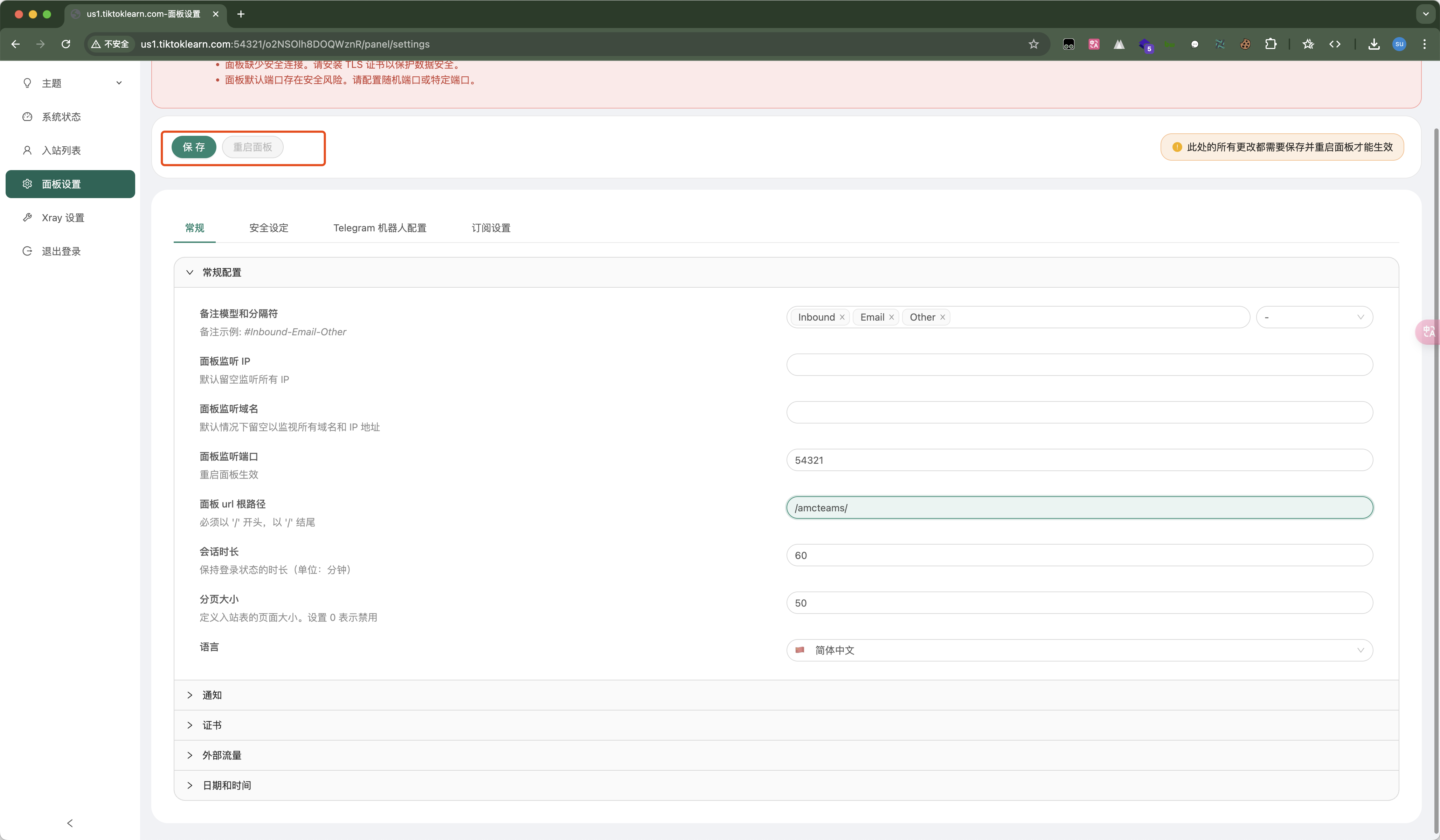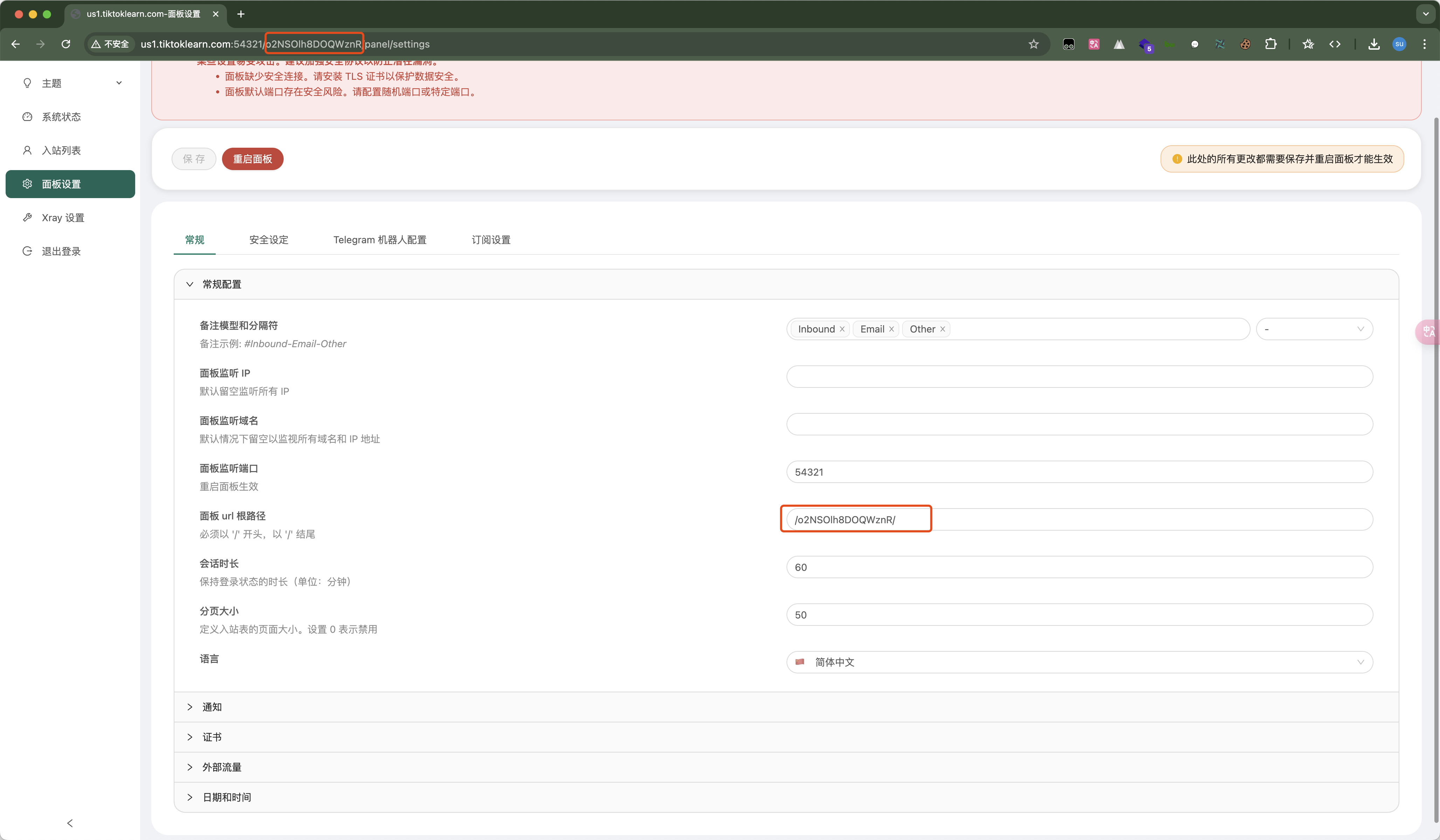 - 进入面板之后,可以在面板设置中面板url根路径修改,也可以不修改。我这边为了好记,就修改成我容易记的。