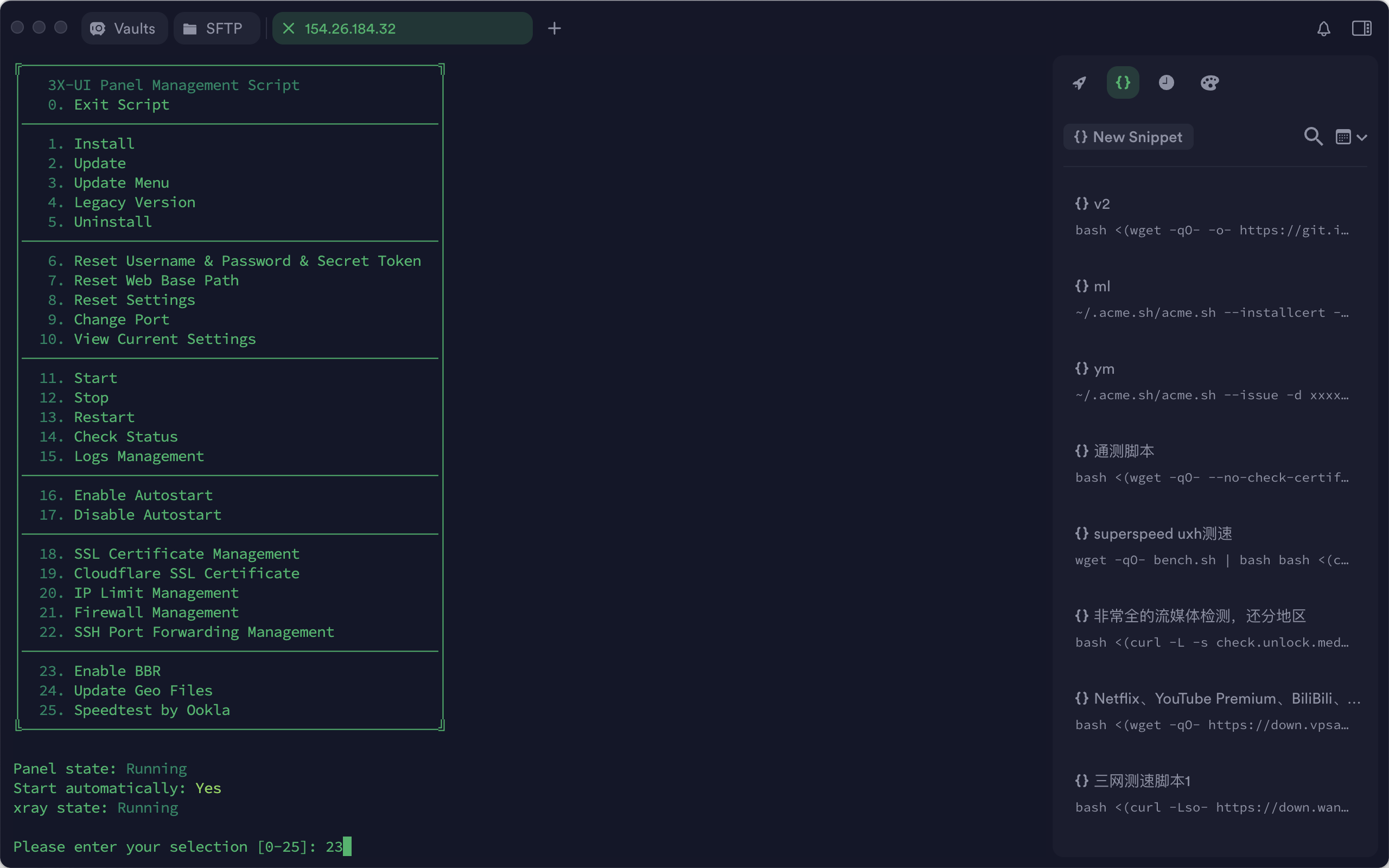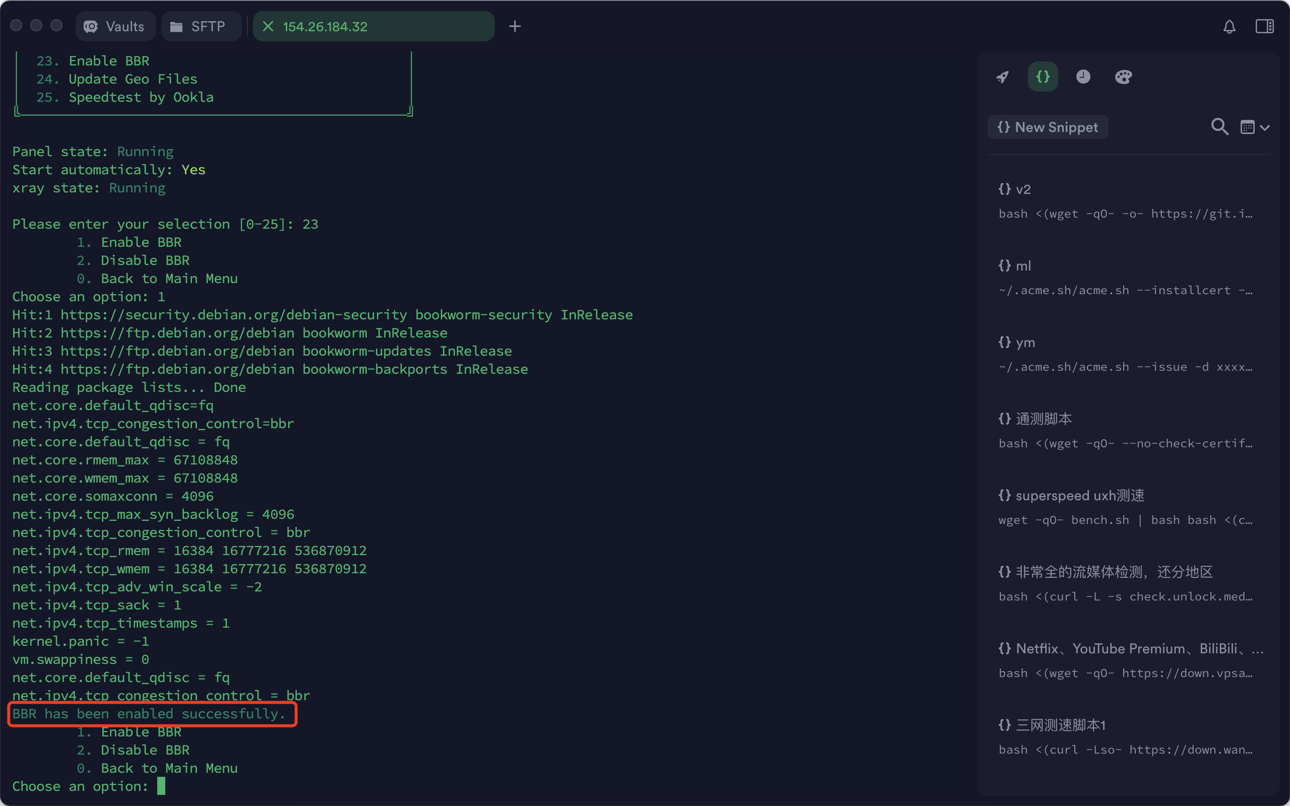 - SSH输入x-ui,选择23启用BBR,再输入1确认。