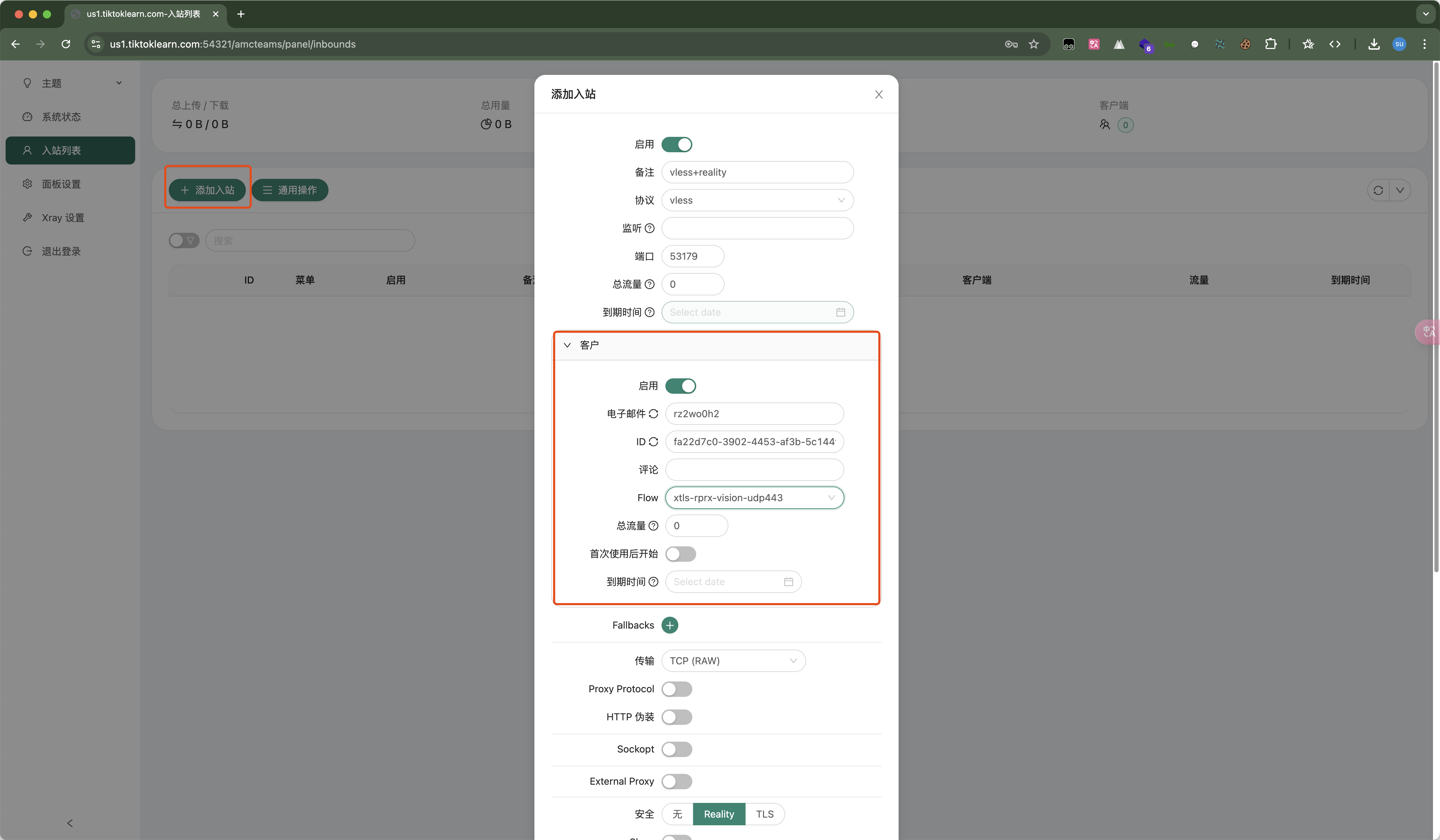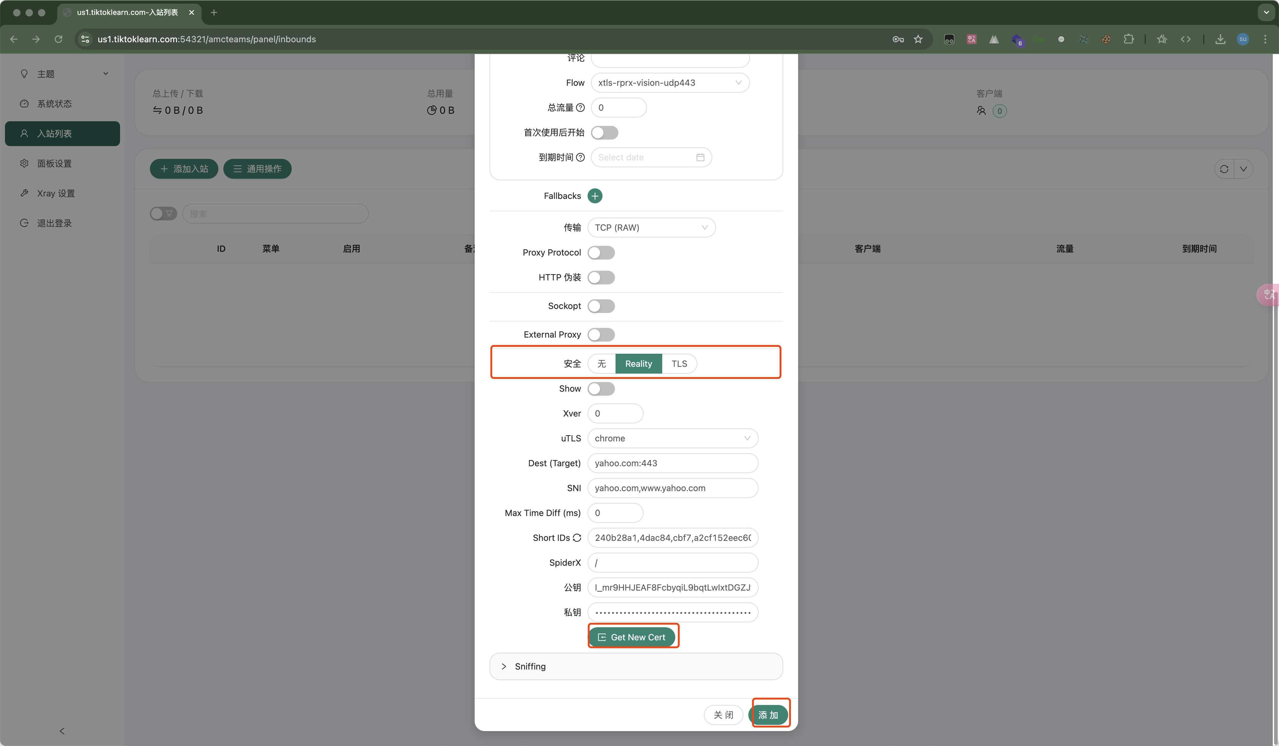 - 添加节点:在面板中选择协议(推荐VLESS+REALITY,抗封锁能力强),设置端口和伪装域名。