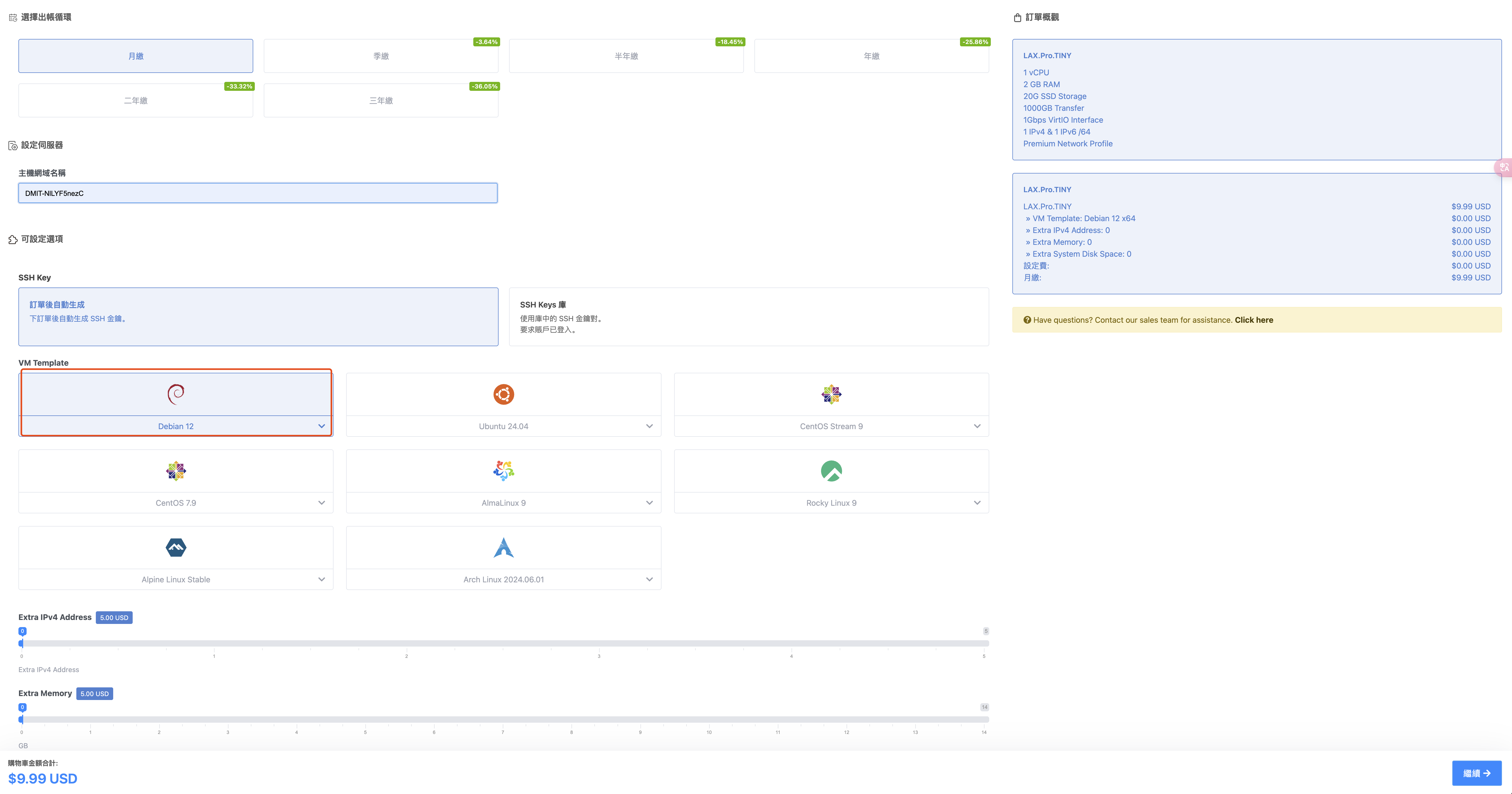 这边我拿CN2 GIA的线路举例。接下来点击继续购买和创建服务器。这里需要选择Debian 12的系统。其他选项默认。