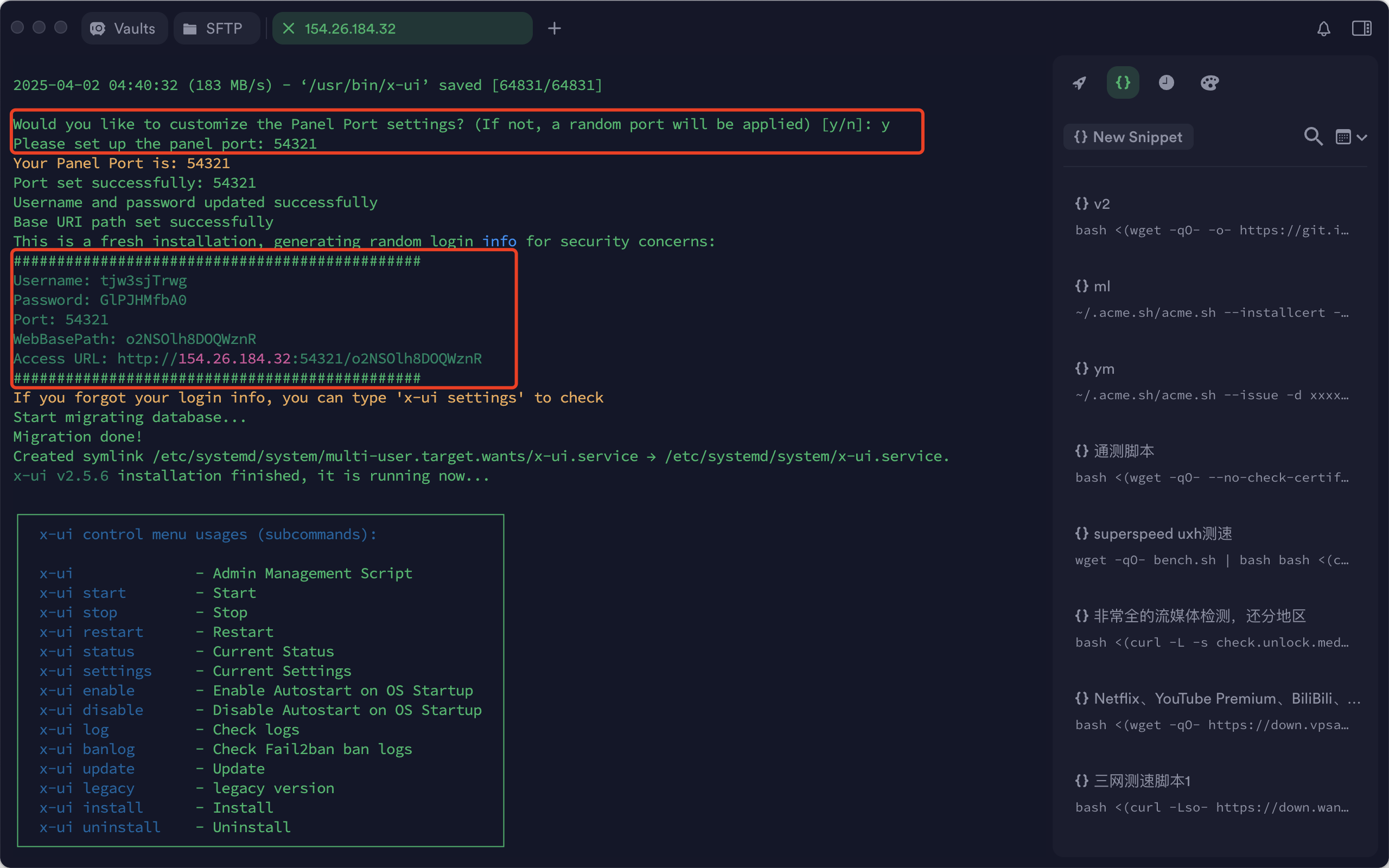 - 安装结果:完成后会显示面板URL、端口、用户名和密码,截图保存,别丢了
